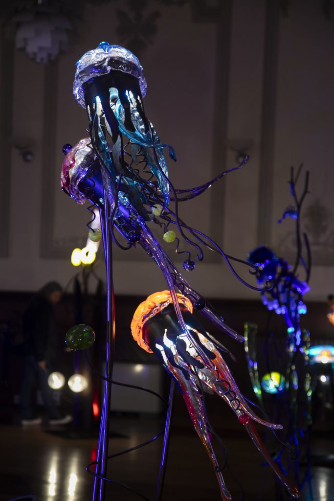 La exposición despliega el particular universo marino de Flyppy en la Sala Alta del Casino, donde la iluminación y la arquitectura del espacio contribuyen a recrear un sugerente fondo submarino. Esculturas de peces, medusas, calamares y otras criaturas marinas parecen flotar, suspendidas en un diálogo constante entre color, forma y movimiento. El visitante se adentra así en un mar imaginado, poético y lúdico, en el que las sardinas conviven con flores en una narrativa visual que apela tanto a la fantasía como a la memoria.